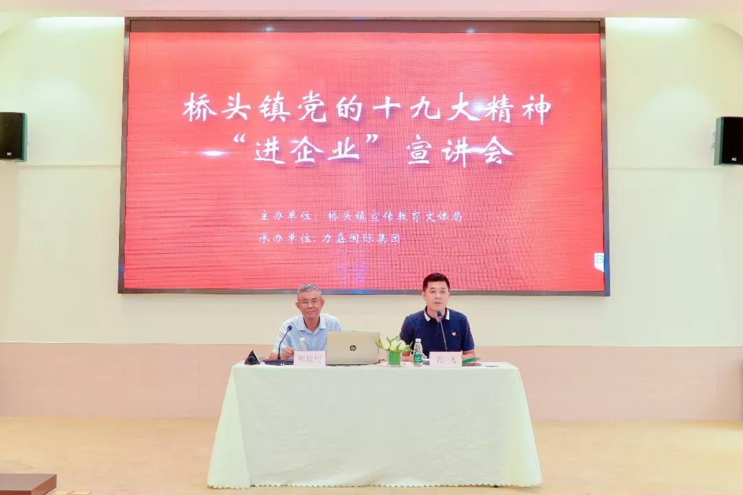 2018年7月30日上午10:00,由橋頭鎮(zhèn)宣傳教育文體局主辦,力嘉國際集團(tuán)擔(dān)任承辦單位的橋頭鎮(zhèn)黨的十九大精神“進(jìn)企業(yè)”宣講會在我園隆重舉辦,出席本次活動的領(lǐng)導(dǎo)有橋頭鎮(zhèn)宣傳教育文體局局長張飛、力嘉國際集團(tuán)董事長助理馬松綿、以及東莞市周邊企業(yè)代表,共百余人參加了此次宣講會。